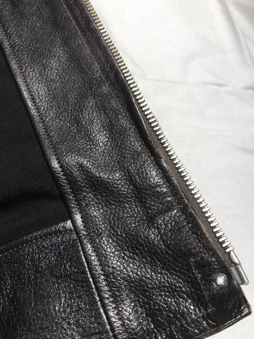 (裏地側のファスナートップやエンド部など革の重なりやファスナーテープの重なりが大きい部分は針穴を拾えない箇所があります。皮革自体が柔らかいジャケットの場合は裏地側の針穴は拾うことは出来ません)