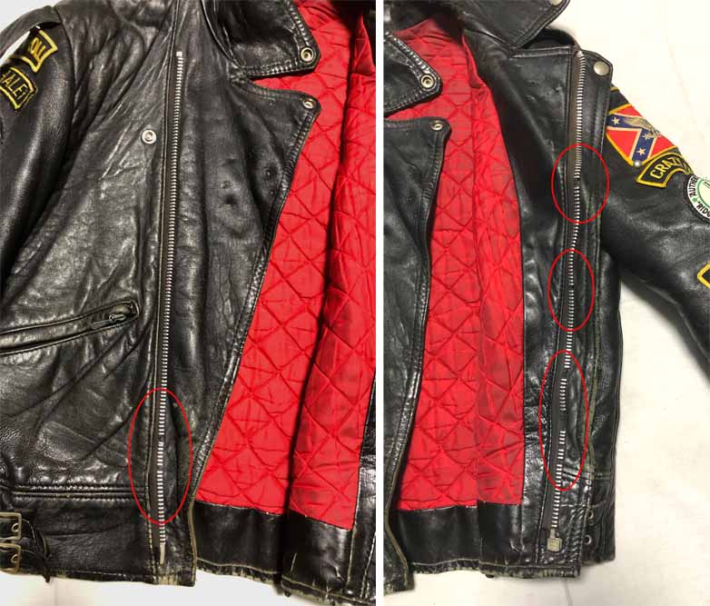 ※今回のジャケットはシープ製で柔らかく、皮革にもかなりヨレがある為、ファスナー裏側の縫製(針穴)は拾えないことをご了承いただいています。